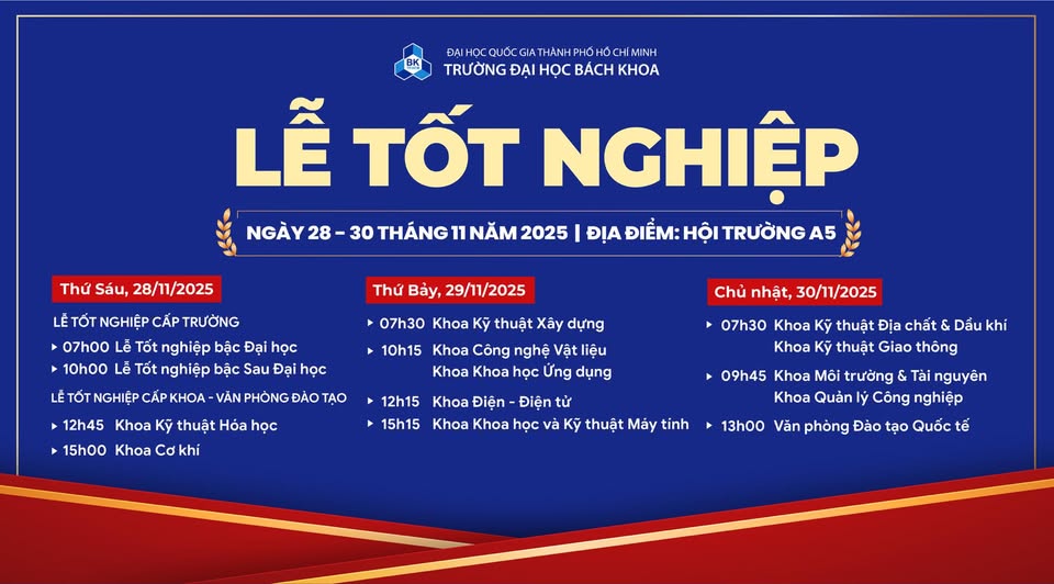 Trường Đại học Bách khoa – ĐHQG-HCM trân trọng chúc mừng các nghiên cứu sinh, học viên cao học và sinh viên chính thức tốt nghiệp vào tháng 11 năm 2025.
